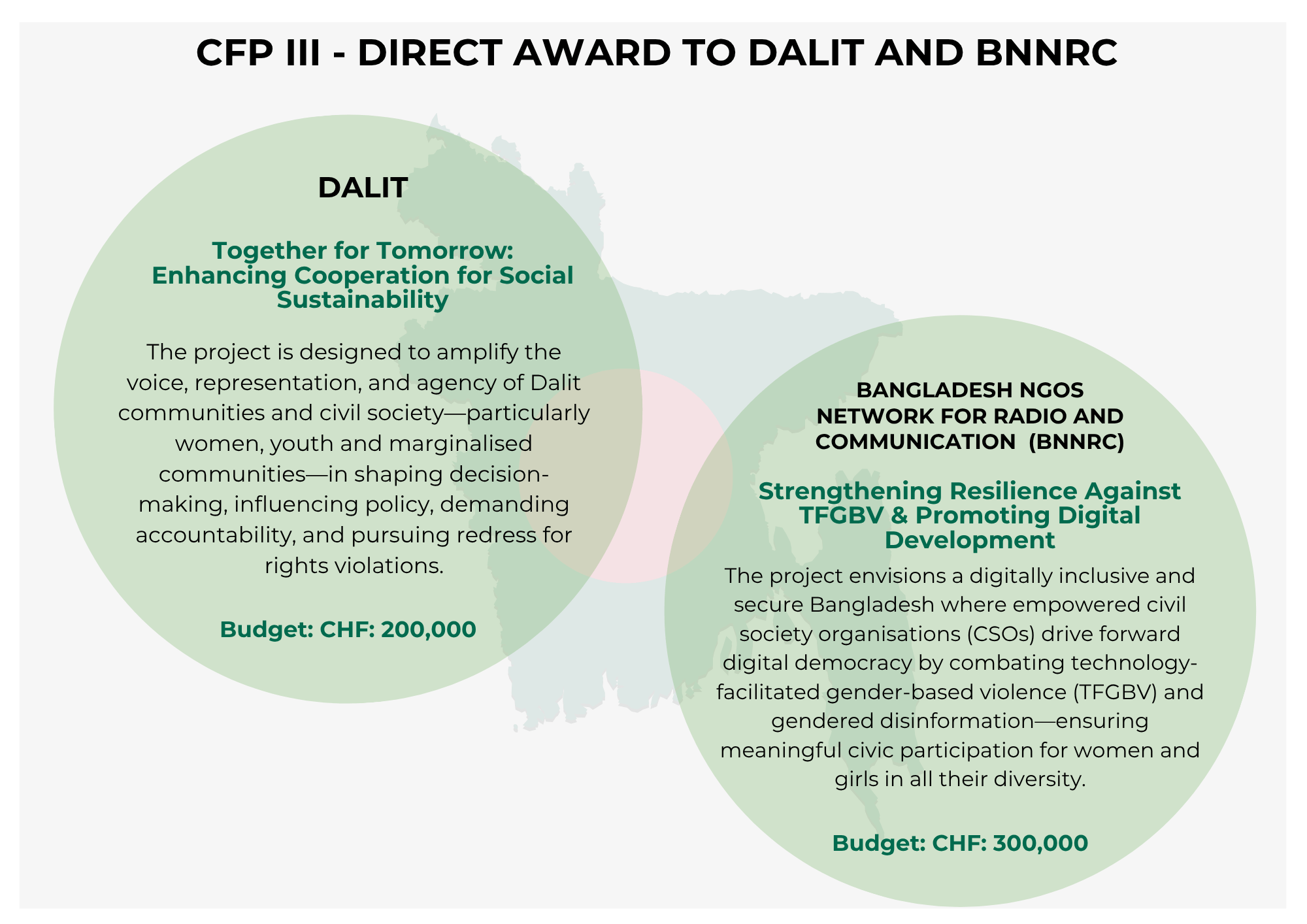 Under this Call for Proposals (CfP), two distinguished organisations—Dalit and BNNRC—have been identified as recipients of grants through a direct award modality, reflecting their strategic alignment with CEF's programmatic priorities. Dalit—Recognised for its unwavering commitment to promoting the rights, dignity, and socio-economic inclusion of the Dalit community—was specifically recommended by Development Partners (DPs) as a CEF grantee for direct awards. BNNRC—Proposed a concept to the CEF: Nagorikata Programme, leveraging approaches to combat technology-driven violence against women. The concept has undergone a review and secured approval from DPs, underscoring its relevance and strategic fit within CEF's objectives. This initiative represents a targeted approach to addressing critical gaps in social inclusion and digital rights protection.