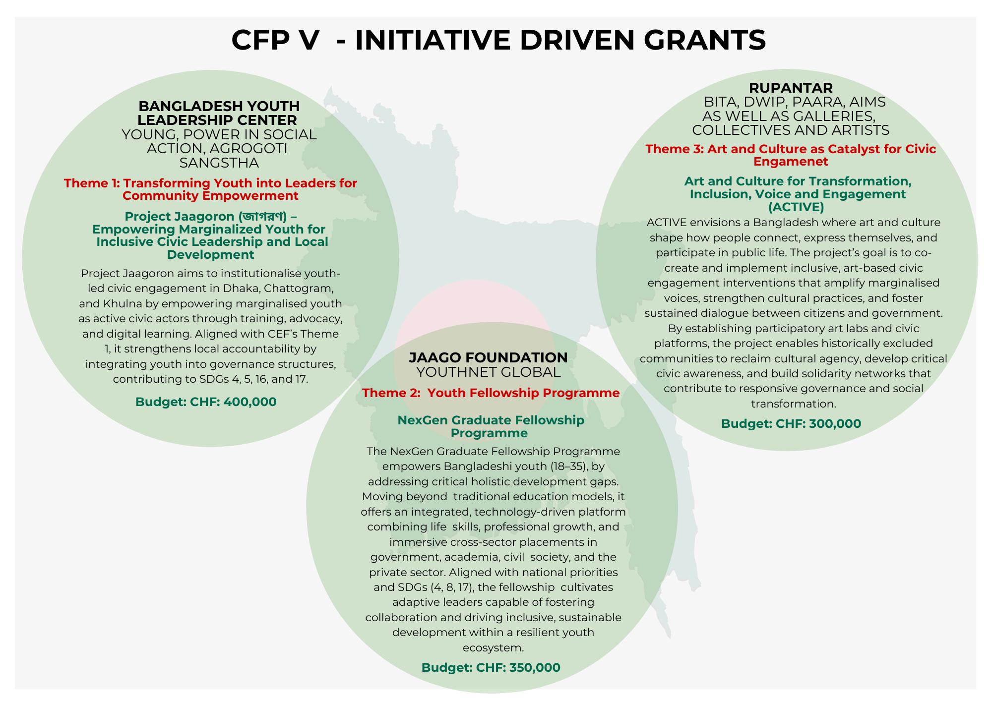 Consortium Partners: Young Power in Social Action (YPSA), Agrogoti Sangstha Theme 1: Transforming Youth into Leaders for Community Empowerment Project Jaagoron (জাগরণ) – Empowering Marginalized Youth for Inclusive Civic Leadership and Local Development Project Jaagoron aims to institutionalise youth-led civic engagement in Dhaka, Chattogram, and Khulna by empowering marginalised youth as active civic actors through training, advocacy, and digital learning. Aligned with CEF’s Theme 1, it strengthens local accountability by integrating youth into governance structures, contributing to SDGs 4, 5, 16, and 17. Budget: CHF 400,000