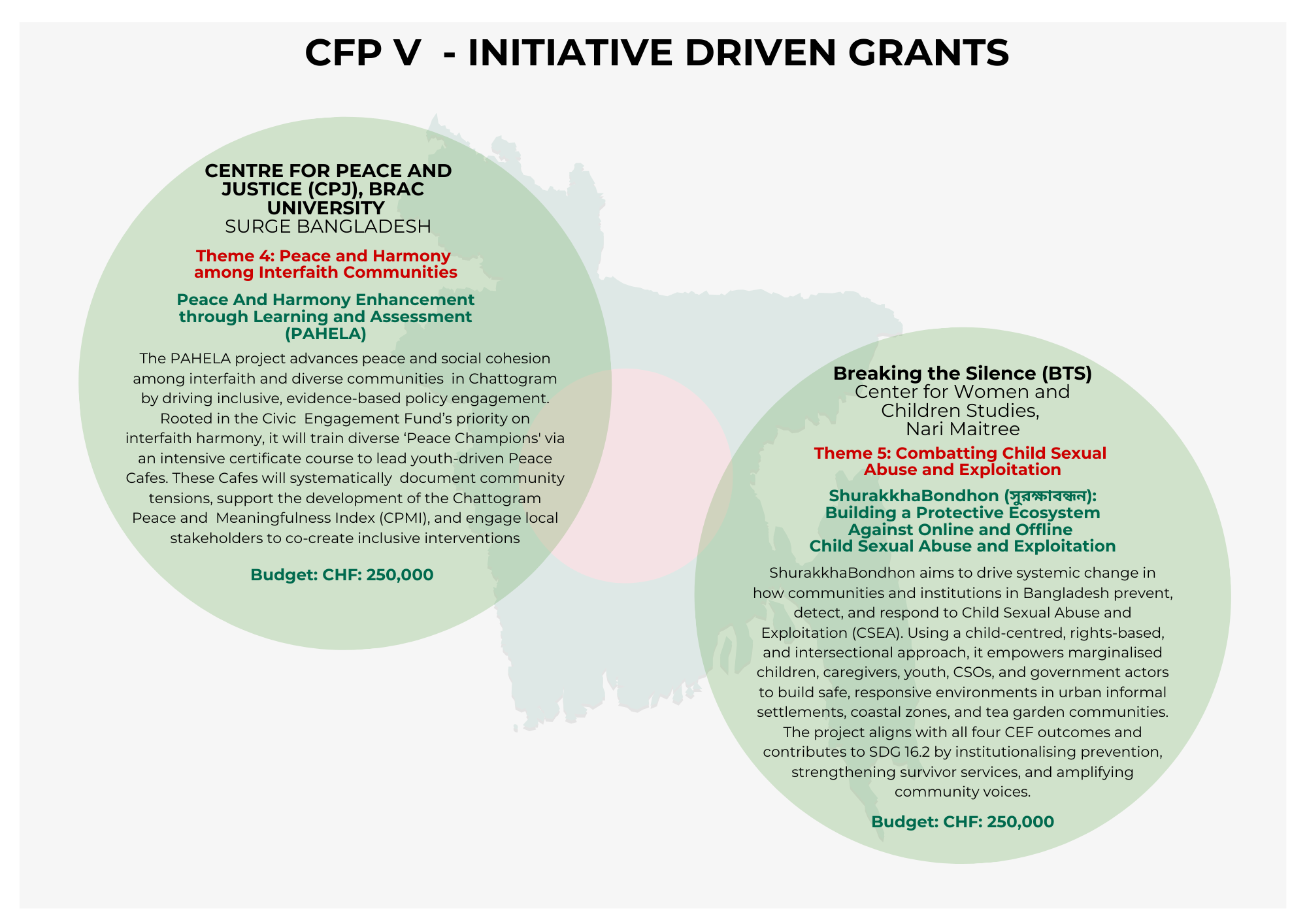 Theme 5: Combatting Child Sexual Abuse and Exploitation ShurakkhaBondhon (সুরক্ষাবন্ধন): Building a Protective Ecosystem Against Online and Offline Child Sexual Abuse and Exploitation ShurakkhaBondhon aims to drive systemic change in how communities and institutions in Bangladesh prevent, detect, and respond to Child Sexual Abuse and Exploitation (CSAE). Using a child-centred, rights-based, and intersectional approach, it empowers marginalised children, caregivers, youth, CSOs, and government actors to build safe, responsive environments in urban informal settlements, coastal zones, and tea garden communities. The project aligns with all four CEF outcomes and contributes to SDG 16.2 by institutionalising prevention, strengthening survivor services, and amplifying community voices. Budget: CHF 250,000